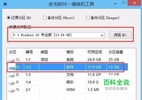 进入PE系统,在老毛桃PE一键装机工具窗口,点击“浏览”将win10系统镜像添加进来,然后在磁盘列表中选择D盘作为系统盘,点击“确定”即可,如图所示: