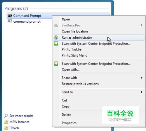 Windows 10、Windows 7 或 Windows Vista为此,请单击“启动”,在“搜索”框中键入命令提示符或 cmd,右键单击“命令提示符”,然后单击“以管理员身份运行”。 如果系统提示你输入管理员密码或进行确认,则键入密码或单击“允许”。