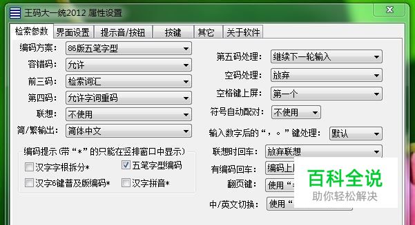 鼠标指针停在界面图标上,右键选择设置可弹出设置界面。第一个界面检索参数:可设置编码方案为86版、98版、新世纪版五笔字形;说说联想功能吧:即打一个字或词可以联系更多的词组出来;如:大家联想出大家庭等;勾选编码提示中的字根拆分则在输入时会出现字根提示;