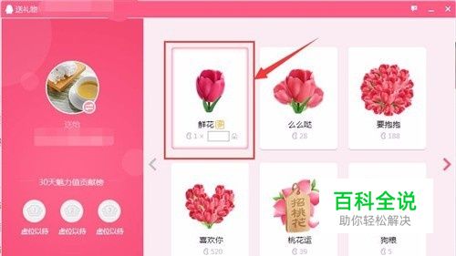 然后选择一个礼物即可,例如选择鲜花,鲜花后面有一个多的字样,表示可以手动输入数字来送多少多鲜花,还有下面一个豆子的图标是金豆,只有拥有了金豆才可以送,如图所示: