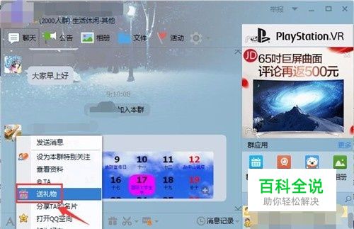 一般来说都是在QQ群里聊着,然后感觉对方不错,想送他礼物,用鼠标右键点击他的头像,点击选择“送礼物”,如图所示: