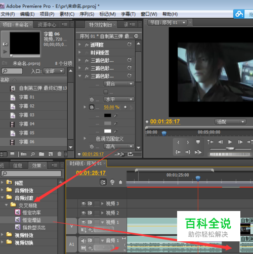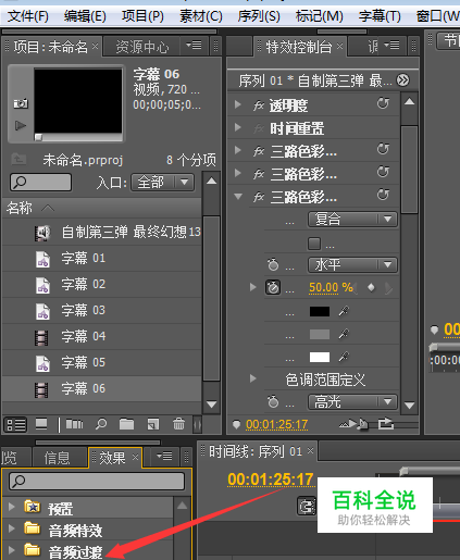音频过渡是在效果面板里面,音频文件的过渡是视频配音一个比较重要的难点,也是重点,需要大量的练习。