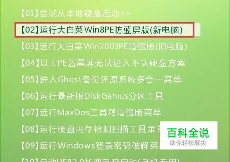 重启电脑,出现开机画面时,通过使用启动快捷键引导u盘启动进入到大白菜主菜单界面,选择“【02】运行大白菜Win8PE防蓝屏版(新电脑)”回车确认。
