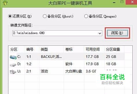 来到大白菜pe系统桌面后,系统会自动弹出大白菜PE一键装机工具,点击“浏览”按钮浏览事先存放在u盘中的win10系统镜像包。