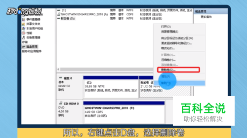 在“磁盘管理中”,先右键“D盘”选择“删除卷”,点击“是”。