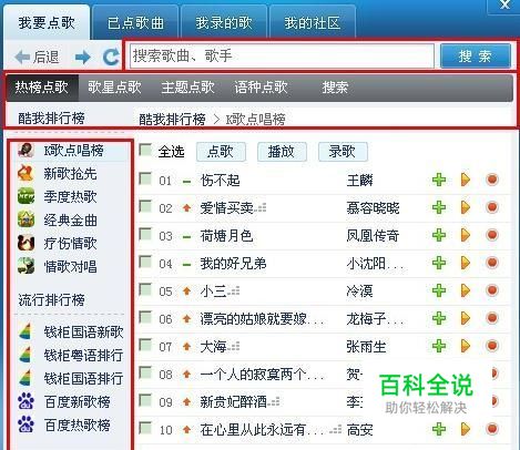 打开软件右下角的“点歌台”,在点歌台里查找想要唱的歌曲,可以通过搜索框、歌星、分类来选歌。