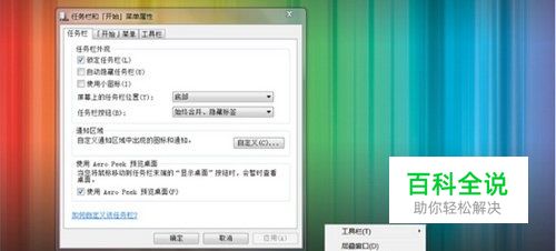 一、打开任务栏属性窗口 在Windows 7中将鼠标移动至任务栏的空白位置点击右键,选择弹出菜单中的属性,调整任务栏的菜单就打开了。 图1 调整任务栏的菜单
