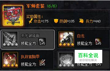 套装图纸获取途径99级点卷商城购买16000一张。需要6.4W点卷 套装组件需求是:破阵武器 破阵坐骑 无懈衣服 破阵天书 格挡玉玺 格挡皇旗 刷城指数 ★★★★★ 副本指数 ★★★★ 擂台指数 ★★★★ 执政套在天将雄师非国战期间,穿在李广这种战法攻击4排的武将身上,效果还是不错的。因为守卫直接减少了1个,但不如贤王套和教皇套撑得久。 执政套是大R国战期间给武将穿戴很不错的选择。因为大R的宝石和圣物都比较高,3破阵的战法攻击,基本可以保证输出,杀敌数就有了保障;而防御能力又比将军和独裁套高,对遇上小号轮番上的大R来说,又能保证不错的抗打击能力。