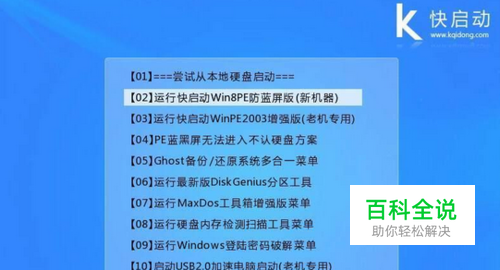 进入到快启动的主菜单界面后,用键盘上的上下键将光标移至“【02】运行快启动Win8PE防蓝屏版(新机器)”并回车确定,如右图所示: