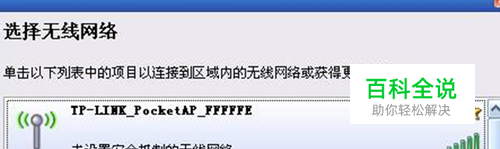 电脑有线或无线连接到TL-WR700N(以Windows XP系统无线连接到TL-WR700N为例),TL-WR700N出厂默认工作在AP模式,默认SSID是:TP-LINK_PocketAP_FFFFFE (“FFFFFE”是 TL-WR700N无线MAC地址后六位),且并未设置无线安全。电脑扫描环境中的无线网络,选中TL-WR700N的无线SSID,并点击“连接”,连接上之后,如下图所示。