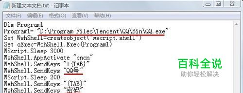 输入下列代码。 Dim Program1 Program1= "QQ路径" Set WshShell=createobject("wscript.shell") Set oExec=WshShell.Exec(Program1) WScript.Sleep 3000 WshShell.AppActivate "cncn" WshShell.SendKeys "+{TAB}" WshShell.SendKeys "QQ号" WScript.Sleep 200 WshShell.SendKeys "{TAB}" WshShell.SendKeys "密码" WScript.Sleep 200 WshShell.SendKeys "{ENTER}"