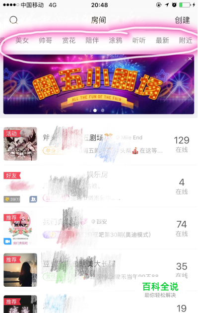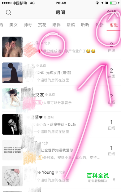 打开软件,进入到房间页面,有很多不同的主题可以选择,其中包括新秀房,美女房、帅哥房、赏花房、陪伴房、涂鸦房、听听房、最新房,和附近房!点击附近房就可以世界筛查选出同城的交友房间了!