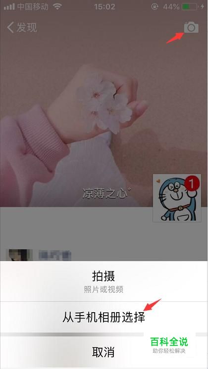 首先我们先在朋友圈页面点击右上角的照相机图标,随便选择一种方式。