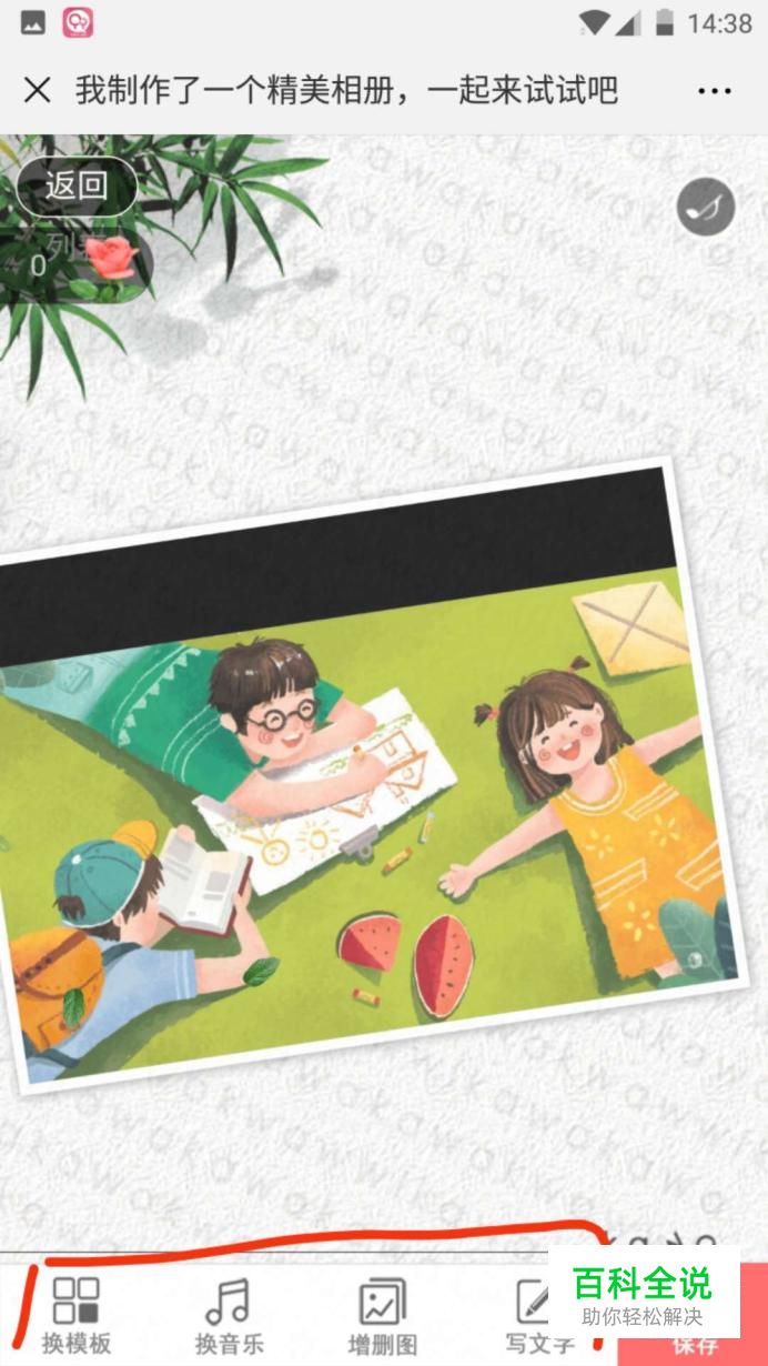 点击后,系统会自动帮你制作一个音乐相册,可以看到底部有“换模板”,“换音乐”,“增删图”,“写文字”