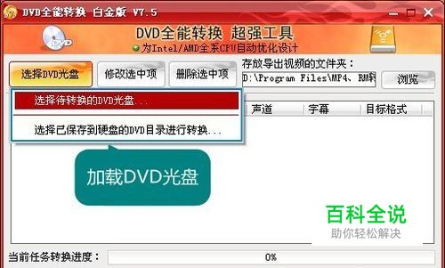 开启DVD全能转换工具,选择加载DVD方式 DVD全能转换工具是《MP4/RM转换专家》的自带工具。首先,打开MP4/RM转换专家,在其主界面右下角点击“DVD全能转换工具”,打开DVD全能转换工具主界面。 进入DVD全能转换工具主界面后,点击左上角的“选择DVD光盘”按钮,在弹出的下拉菜单中,选择一种DVD加载方式,出于人性化的周全考虑,DVD全能转换工具具有从光驱直接加载DVD光盘和从硬盘选择DVD目录转换两种齐全加载方式,从硬盘选择DVD目录转换有助于摒除转换过程中光驱读取的限制,发挥DVD全能转换世界第一的转换速度,还有助于避免光驱读取出错引起的转换意外。