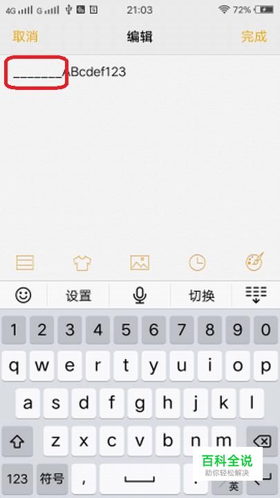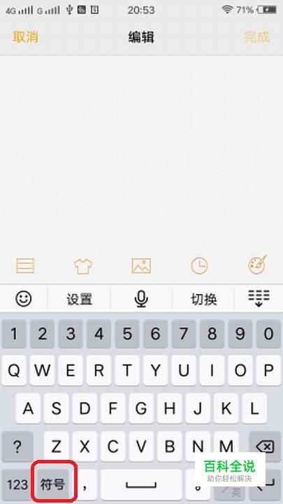 安卓手机输入方法如下: 点击一下文字输入区域,出现键盘,点击“符号”。