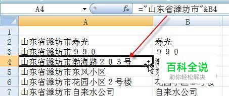 公式合并 假设数据包含固定内容“山东省潍坊市”,需要输入到A2:A10单元格区域。我们可以在B2:B10区域先输入数据中除固定内容以外的那些内容,然后点击A2单元格,输入公式“="山东省潍坊市"&B2”,完成后拖动此单元格填充句柄向下复制公式至A10单元格就可以得到完整数据了(图2)。