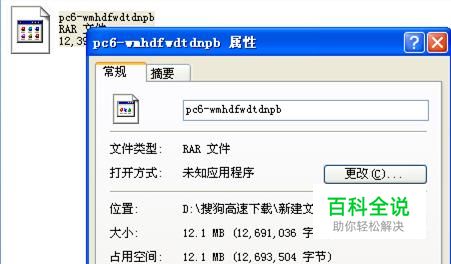 我们在文件上右键单击,查看属性,会看到文件类型。图中这个是“RAR文件”,这是个压缩文件,之所以打不开,是因为系统里没有安装解压缩软件。