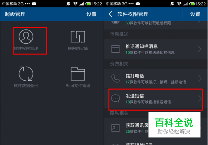 小编平时喜欢玩游戏,但是玩到兴致忽略了游戏发送短信扣费,不小心就订购了,很是桑心。大家要谨防手机扣费陷阱,朋友介绍给小编一个很实用的办法。 首先我们先要授予腾讯手机管家root权限。 之后我们进入管家的超级管理: 进入软件权限管理,点击“发送短信”,这里面汇集了手机上所有可发送短信的软件应用 下面我们随便拿一个禁止短信发送功能做示范: 然后我们进入游戏,调用里面的购买道具功能,这是要发送信息订购的,直接从话费中扣取费用: 就这样!订购短信发送不出去了!短信发送超时,小编亲测拦截发送扣费短信成功,查了下话费,还是满血原地~~木有被扣~~~