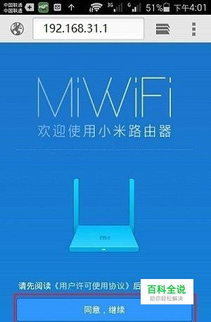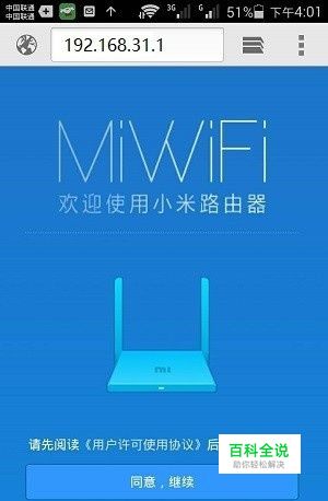先把小米路由器接通电源,打开手机上的WLAN功能,搜索连接到小米路由器的无线信号,如下图所示。 1、小米路由器,默认已经启用了无线网络,且无线网络未加密,可以直接进行连接。 2、小米路由器的默认WiFi名称是:Xiaomi_XXXX_XXXX。 3、正确连接小米路由器之后,手机暂时就不能上网了,当小米路由器设置成功之后,自动就能上网的。 打开手机上的浏览器,在地址栏中,输入192.168.31.1,打开设置界面。