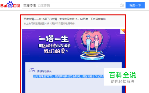 然后就是将我们生成密码“解密123456”,通过各种沟通交流的工具发给自己想发的人,让他们通过这个密码来解密。 对方只需要打开百度,在百度搜索栏中输入“解密123456”,就可以成功的看到我们想要传情的内容了。