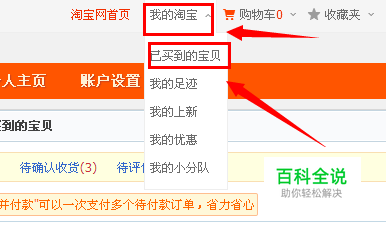 进入到淘宝网后点击上面的“已买到的宝贝”
