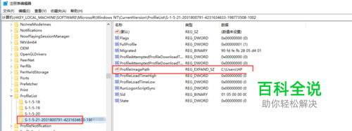 接着在ProfileList文件夹下的分支找到含有ProfileImagePath并指向你的用户文件夹的值,如下图所示