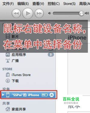 先将iPhone通过数据线连接电脑,打开iTunes,在iTunes左侧栏中,鼠标右击“设备”名称(以左图为例,鼠标右键“SSPai的iPhone”即可弹出菜单),在菜单中选择“备份”。