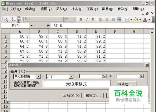 然后:打开菜单“格式”->“条件格式”,打开条件格式窗口