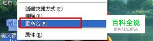 如下图,我对一个doc文件重命名,文件名原来是“春风得意.doc”。然后我想改成“春风得意马蹄急”。右击,重命名。如下图。