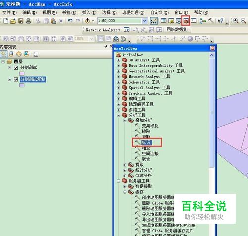 在工具栏中点击“Arctoolbox”按钮,弹出Arctoolbox工具箱。选择“分析工具”——“叠加分析”——“标识”,双击