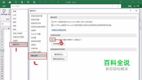 如果这里提示,无法共享的情况,所以可以按照提示,到信任中心——隐私选项中——把从文件属性中删除个人信息前面的勾选,去掉,即可共享工作簿。