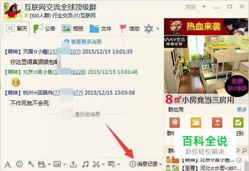 然后双击qq群图标进入到qq群里面,然后点击“消息记录”。