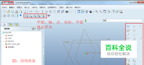 草绘是最基本的绘图操作,因为三维模型的建立是在二维的基础上建立起来的。首先,确认【平面显示】开关处于打开,可以看到初始的三个平面,FRONT、RIGHT和TOP。点击【草绘】按钮,弹出草绘的对话框,选择草绘的平面,如TOP。