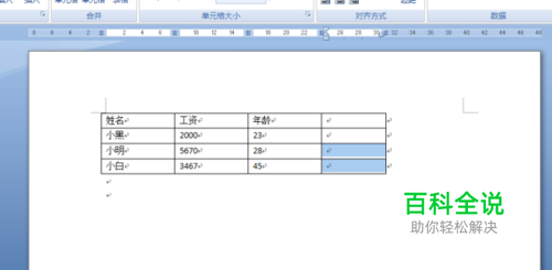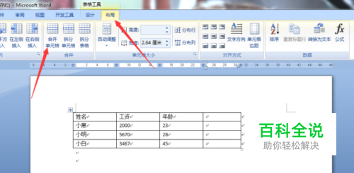 选中单元格后,单击”布局“功能区,在功能区中选择”合并单元格“,如图二,这是合并后的效果。