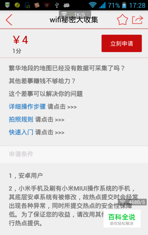 找到适合你的微任务,小编以“采集WIFI”为例,收集各处的WIFI热点。 在申请任务前,我们需要先认真查看任务描述和申请条件,别做无用功哟。