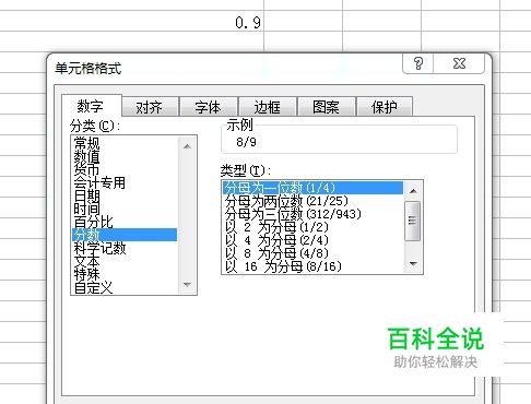 在弹出来的“单元格格式”中,选择“数字”选项卡,在分类中选择“分数”,然后点击确定即可。