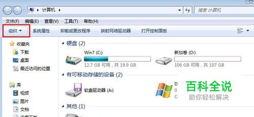 首先,我们打开计算,在左上方,找到并点击:组织,如图。