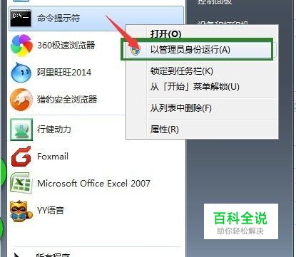win7系统可以直接找到命令提示符打开,但记得要以“管理员身份运行”否则权限不够可能查询不到。