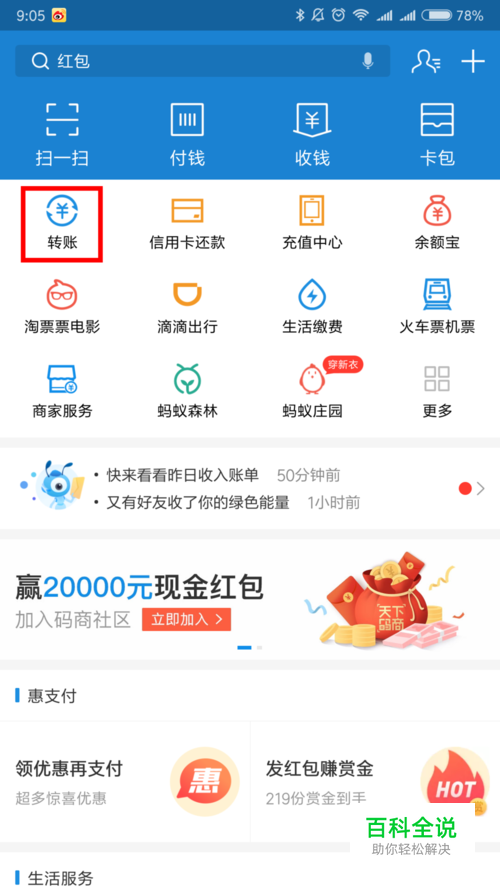 打开手机支付宝首页,点击【转账】,进入到转账页面。