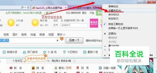 打开IE浏览器之后,在IE菜单栏的空白处右击一下,在弹出的对话框中点击“收藏夹栏”这个选项即可。
