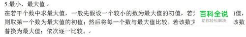 在若干个数中求最大值,一般先假设一个较小的数为最大值的初值,若无法估计较小的值,则取第一个数为最大值的初值;然后将每一个数与最大值比较,若该数大于最大值,将该数替换为最大值;依次逐一比较。
