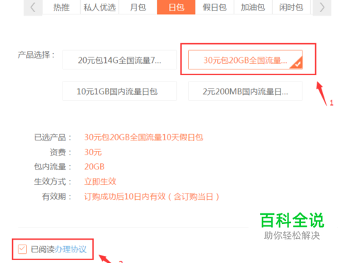 ③选择“30元包20GB全国流量10天假日包”>在“已阅读办理协议”前打钩,最后选择“立即办理”即可。