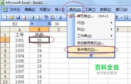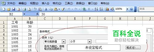 我们通过一个例子说明 条件格式工具的使用。 要从下列数据中 找出未成年人。 首先,点中第一个要分析的数据"B2",然后点击菜单栏的选项“格式”、“条件格式”