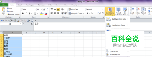 选中A列,点击开始菜单home---conditional formatting条件格式----new rule新建规则