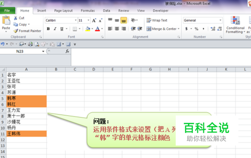 运用条件格式来设置(把A列内容包含“韩”字的单元格标注颜色)