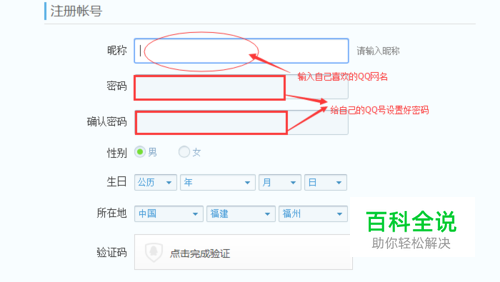 现在大家可以可以看到出现的网页,如下图所示;填好自己喜欢的” 网名“(这个网名即将是你自己QQ号的名字)然后设置一个“ 密码”(就是你等会你申请到的QQ号的登录密码),设置好这两项之后我们接着看下一个。【如下图】