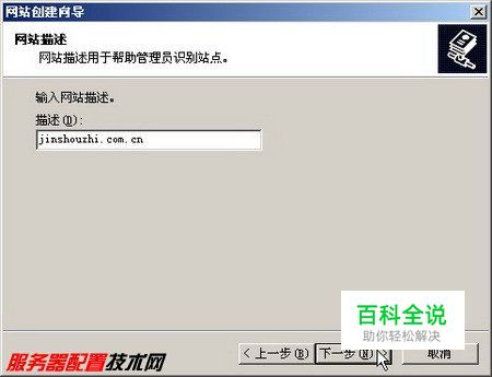 第2步,打开“网站描述”对话框,在“描述”编辑框中输入一段描述网站内容的文字信息,并单击“下一步”按钮。