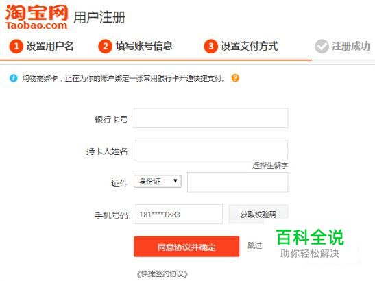 设置支付方式。填写银行卡号、持卡人姓名、证件号码、获取校验码,点击【统一协议并确定】;PS:该步骤可跳过,直接到下一步
