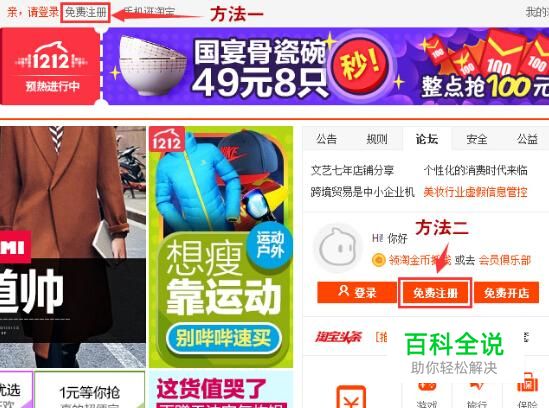 一、注册淘宝账户 登录淘宝网http://www.taobao.com/,在淘宝网首页进行点击【免费注册】,见下图